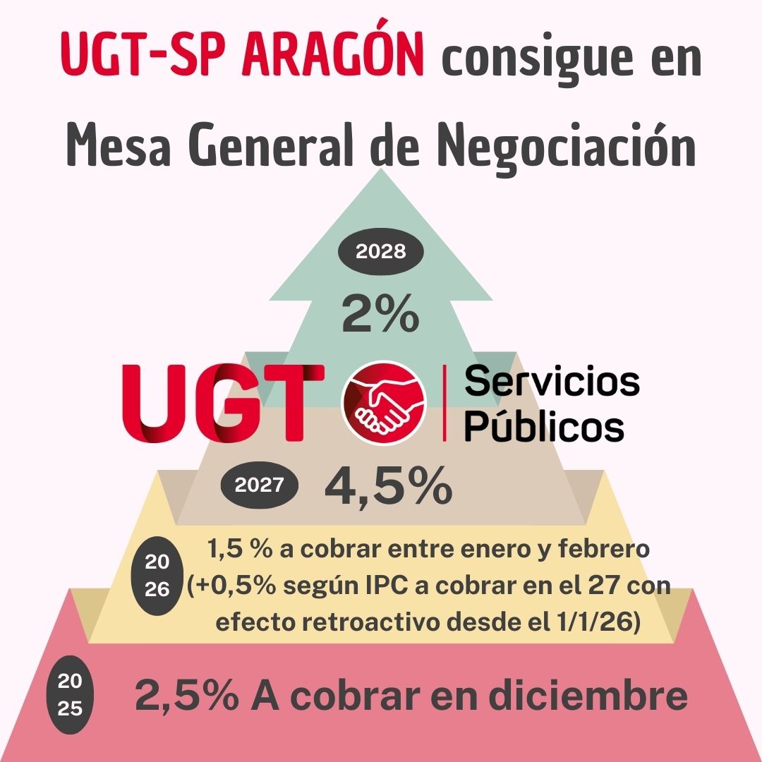 Desde UGT Servicios Públicos Aragón valoramos muy positivamente la aprobación por parte del Gobierno de Aragón de la inmediata aplicación de la subida salarial que beneficiará a todo el personal público de la Comunidad —una inversión de más de 70 millones de euros antes de finalizar el año.